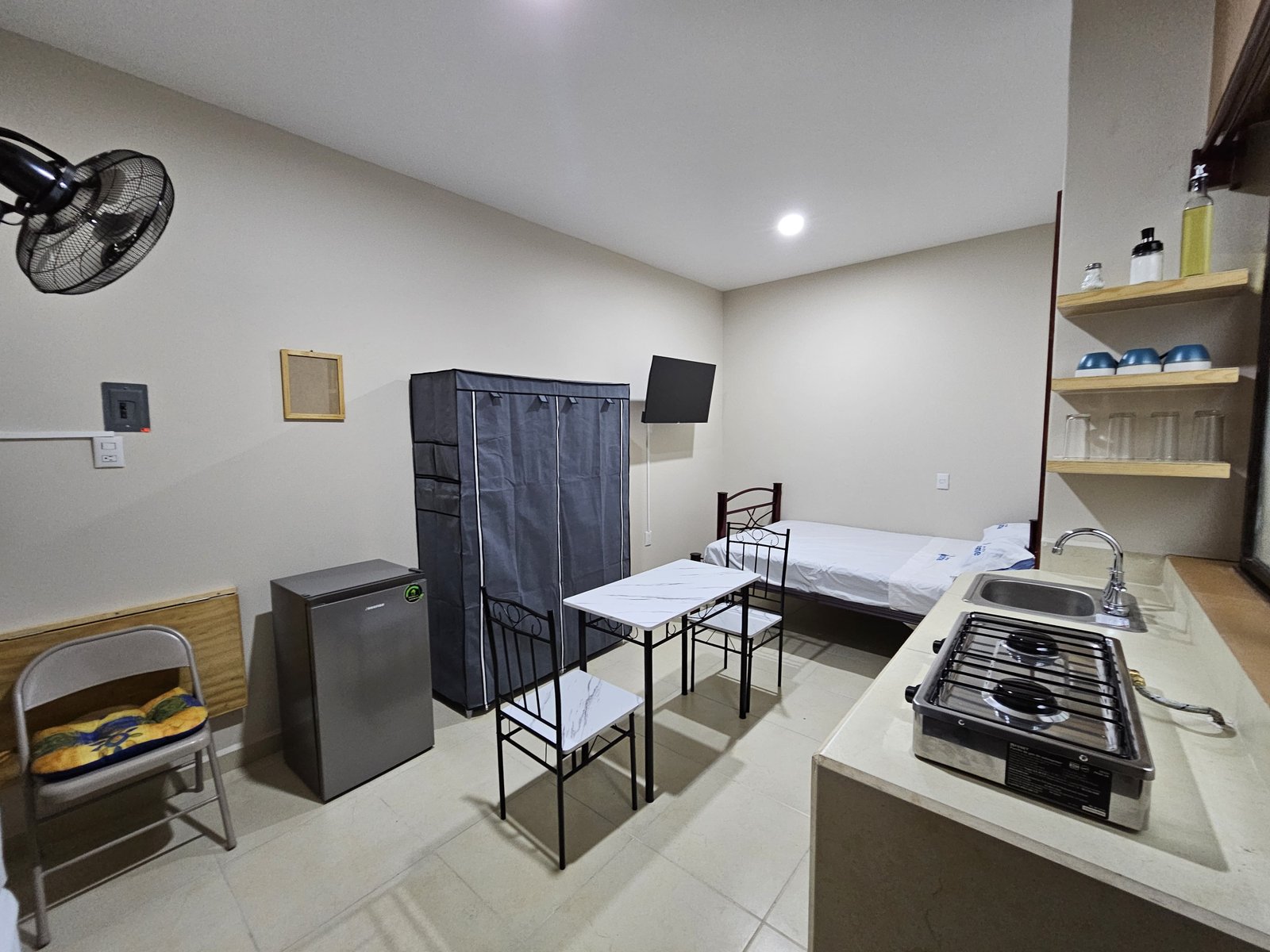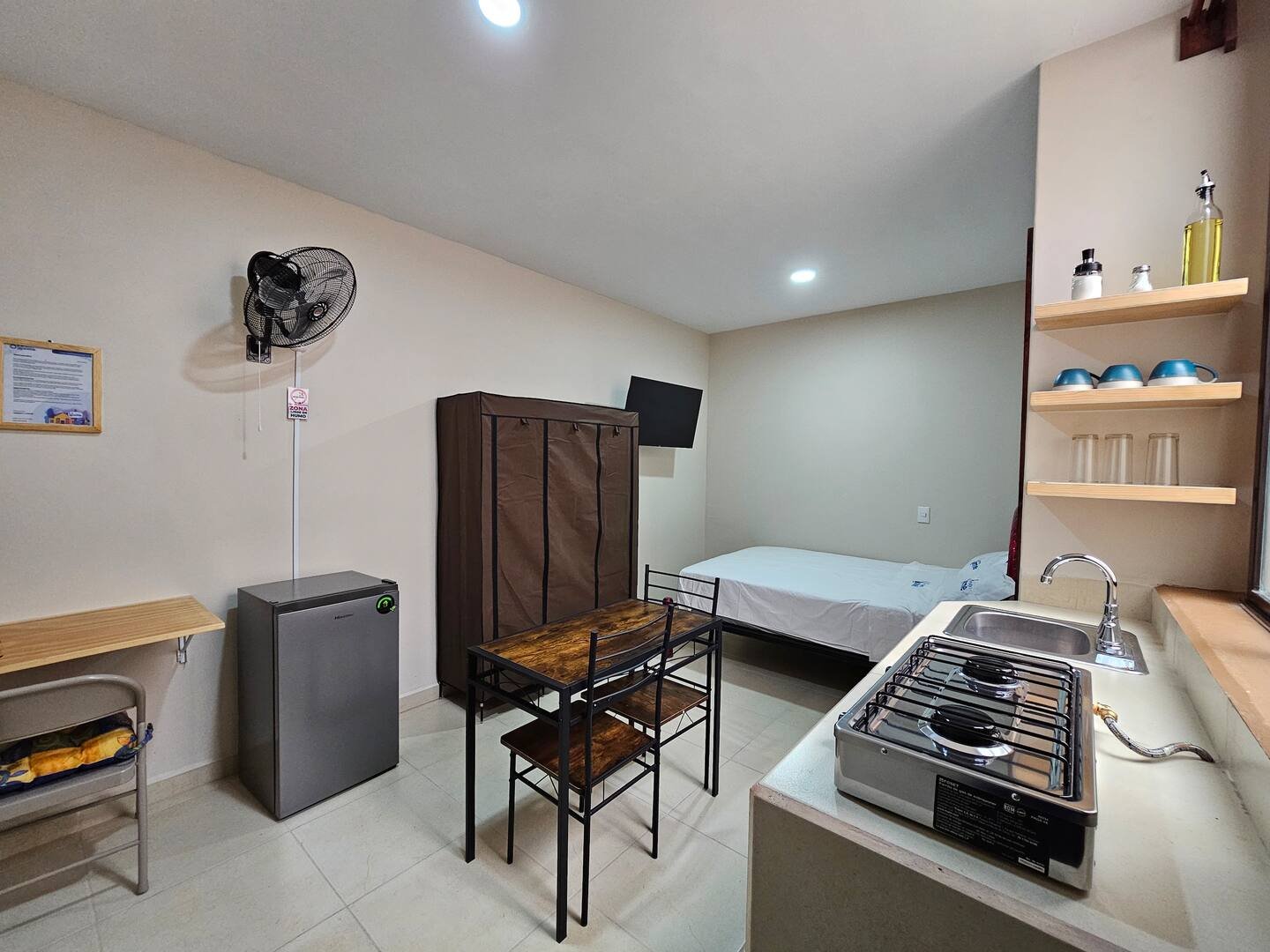 ¡Te sentirás como en casa (o mejor)! Nuestro alojamiento tiene todo lo que necesitas para una estancia cómoda y divertida. La recámara es luminosa, con una cama súper cómoda. El ventilador de techo te mantendrá fresco mientras disfrutas de tu serie favorita en la TV. Con estantes para organizar tus cosas y un ambiente cálido, es el lugar perfecto para relajarte y recargar energías. ¡Ven y disfruta de este espacio diseñado especialmente para ti!